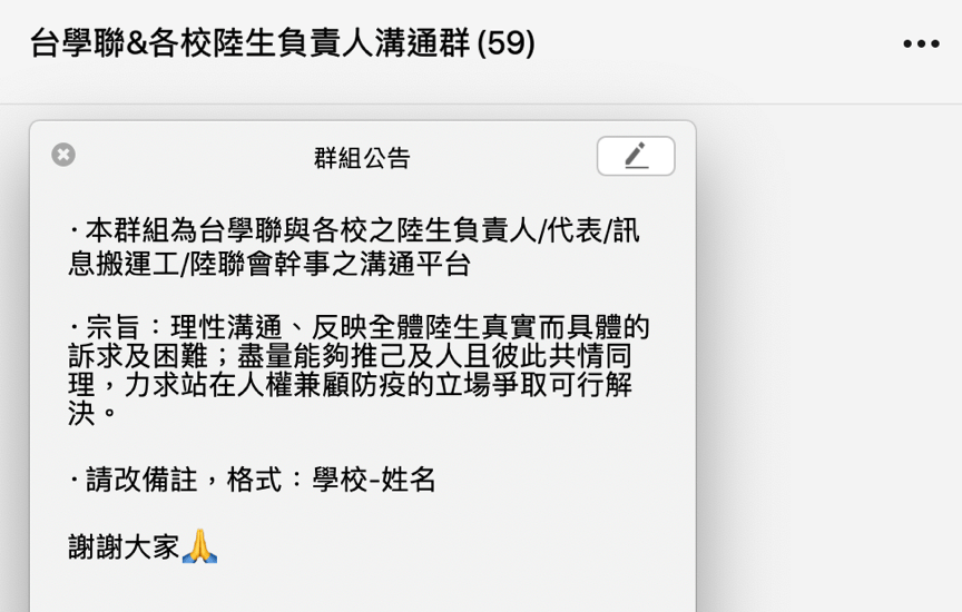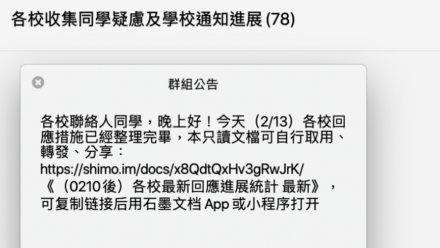 在之后的阶段(01/27-02/07),陆生真正的「自救」开始展开:联署活动的继续进行、「新冠肺炎-在台陆生关注组」的粉专开设、各校方回应统计群的持续整理都是每日日程。